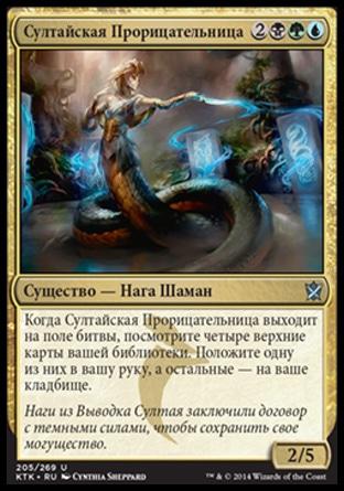 Карта Безжалостная Гадательница пойдёт всем, кто играет чёрным цветом, однако в связке с картой Кровосос из Керу вы сами выбираете кто умрёт и когда брать карты. Но самое главное, что все эти действия также наполняют вам кладбище. А значит, будет работать главное свойство Султаев – Выкапывание.