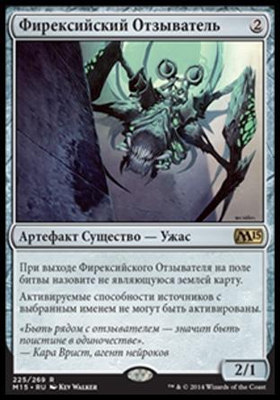Phyrexian Revoker – маленький агент Фирексии выполняет значимую роль, еще больше запутывая игру оппонента. Целей для его применения в Легаси предостаточно – Sensei's Divining Top, Lion's Eye Diamond, Lotus Petal, Grim Lavamancer, Sneak Attack, Grindstone, Simian Spirit Guide, Deathrite Shaman, все возможные Planeswalkers, любое оборудование и так далее. В редких матчах Отзыватель совершенно бесполезен, в таком случае он отсайживается после первой партии. По сравнению с Pithing Needle у Отзывателя есть как плюсы (тело 2/1, возможность указать в качестве цели манадающие источники, не являющиеся землями), так и минусы (уже упомянутая невозможность выбрать целью мешающие земли противника). При этом Отзыватель легко ставится с бесцветных земель, давая нам возможность использовать Равнины для розыгрыша других существ. Обязательно помните, что Вы называете цель для Отзывателя в момент, когда он выходит на поле битвы, в этом случае у оппонента уже нет возможности использовать способности названного перманента.