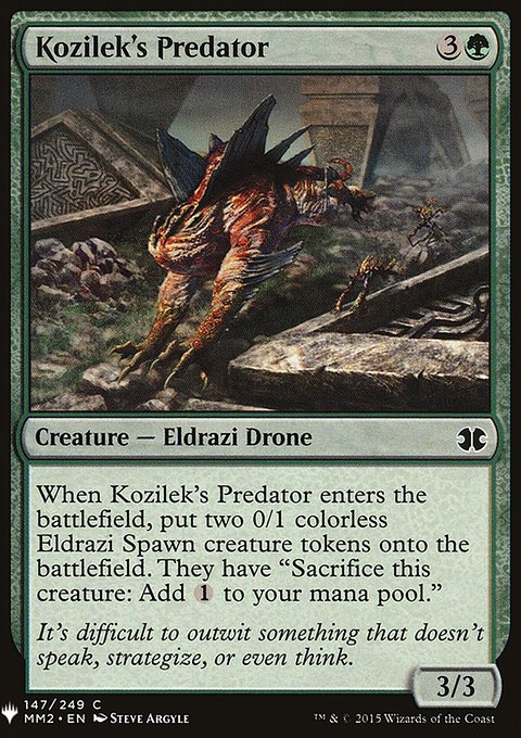 Когда Хищник Козилека выходит на поле битвы, положите на поле битвы две фишки существа 0/1 бесцветный Эльдрази Порождение. У них есть способность «Пожертвуйте это существо: добавьте