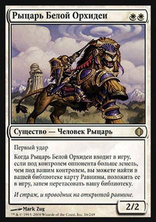 Первый ударКогда Рыцарь Белой Орхидеи выходит на поле битвы, если под контролем оппонента больше земель, чем под вашим контролем, вы можете найти в вашей библиотеке карту Равнины, положить ее на поле битвы, затем перетасовать вашу библиотеку.