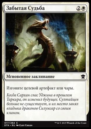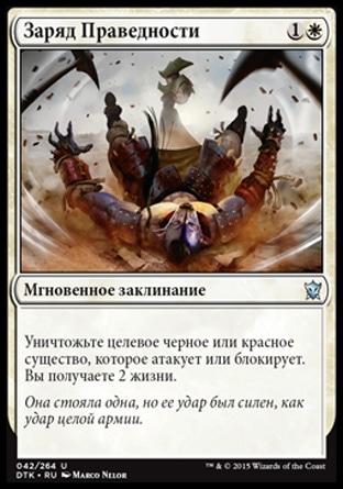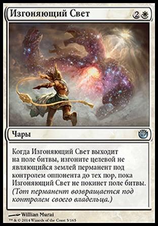. Хороший ремувал, который можно разыграть, повернув трёх существ вместо оплаты маны. Удачно сочетается с бдительными существами. Изгоняет оживших богов и всякие другие неприятные карты, которые могут вылезти из кладбища, что сейчас актуально.