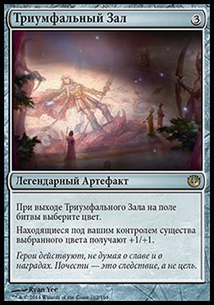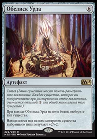 — основа колоды, карта, которая, на мой взгляд, будет некоторое ближайшее время влиять на текущий формат до ротации предыдущего базового сета осенью. Перспективы племенных колод на гоблинах и эльфах, привели к ситуации, когда деки, основанные, на типах существ, могут претендовать на первые места. То, что этот артефакт имеет convoke, придаёт ему особую ценность — при удаче обелиск можно поставить уже на третий ход и это усиление, позволяет нашей колоде чувствовать себя очень уверенно.
