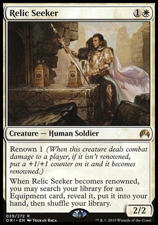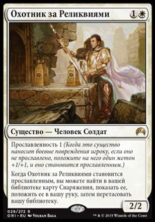 Прославленность 1 (Когда это существо наносит боевые повреждения игроку, если оно не прославлено, положите на него один жетон +1/+1, и оно становится прославленным.)Когда Охотник за Реликвиями становится прославленным, вы можете найти в вашей библиотеке карту Снаряжения, показать ее, положить ее в вашу руку, затем перетасовать вашу библиотеку.