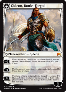 +2: не более чем одно целевое существо под контролем оппонента атакует Гидеона, Закаленного в Битвах во время следующего хода контролирующего его игрока, если это возможно.+1: целевое существо получает Неразрушимость до вашего следующего хода. Разверните то существо.0: до конца хода Гидеон, Закаленный в Битвах становится существом 4/4 Человек Солдат с Неразрушимостью, которое остается planeswalker-ом. Предотвратите все повреждения, которые должны быть нанесены ему в этом ходу.