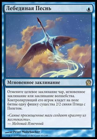 Отмените целевое заклинание чар, мгновенное заклинание или заклинание волшебства. Контролирующий его игрок кладет на поле битвы одну фишку существа 2/2 синяя Птица с Полетом.