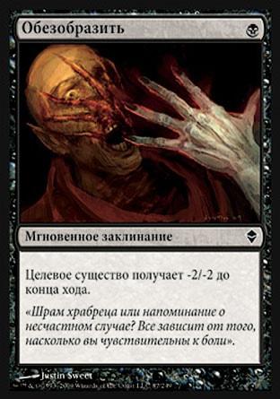 Целевой игрок показывает свою руку. Вы выбираете из нее карту, не являющуюся землей. Тот игрок сбрасывает ту карту. Вы теряете 2 жизни.