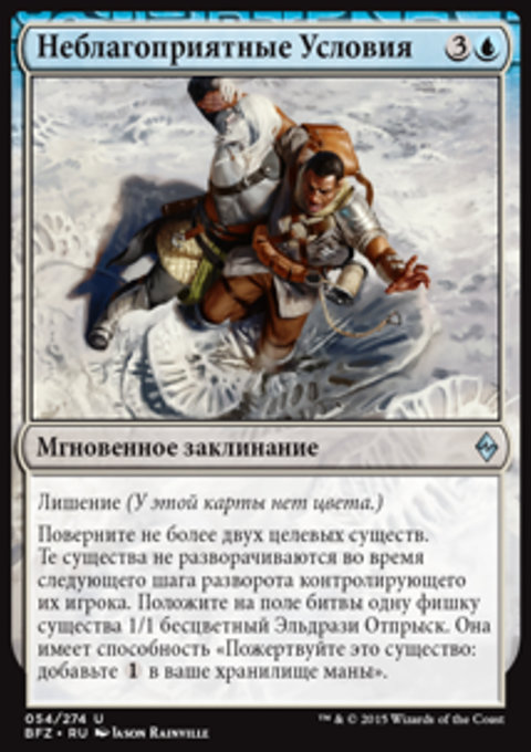 Поверните не более двух целевых существ. Те существа не разворачиваются во время следующего шага разворота контролирующего их игрока. Положите на поле битвы одну фишку существа 1/1 бесцветный Эльдрази Отпрыск. Она имеет способность «Пожертвуйте это существо: добавьте