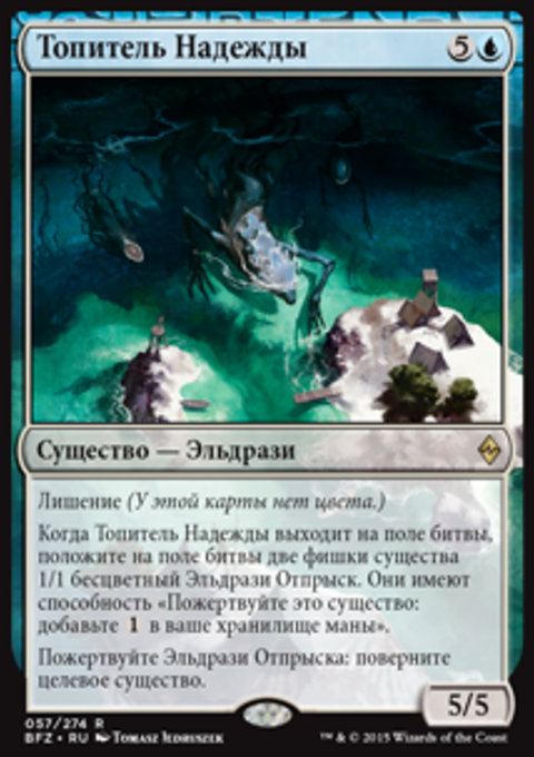 Когда Топитель Надежды выходит на поле битвы, положите на поле битвы две фишки существа 1/1 бесцветный Эльдрази Отпрыск. Они имеют способность «Пожертвуйте это существо: добавьте