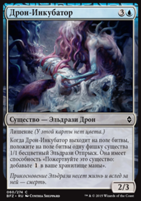 Когда Дрон-Инкубатор выходит на поле битвы, положите на поле битвы одну фишку существа 1/1 бесцветный Эльдрази Отпрыск. Она имеет способность «Пожертвуйте это существо: добавьте