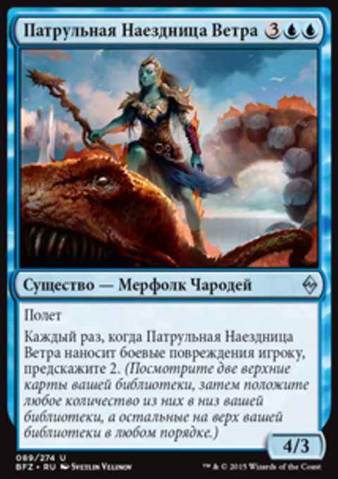 Каждый раз, когда Патрульная Наездница Ветра наносит боевые повреждения игроку, предскажите 2. (Посмотрите две верхние карты вашей библиотеки, затем положите любое количество из них в низ вашей библиотеки, а остальные на верх вашей библиотеки в любом порядке.)