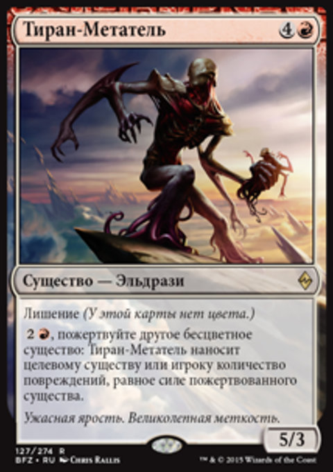 , пожертвуйте другое бесцветное существо: Тиран-Метатель наносит целевому существу или игроку количество повреждений, равное силе пожертвованного существа.