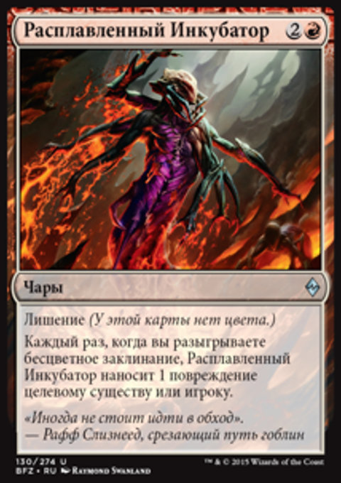 Каждый раз, когда вы разыгрываете бесцветное заклинание, Расплавленный Инкубатор наносит 1 повреждение целевому существу или игроку.