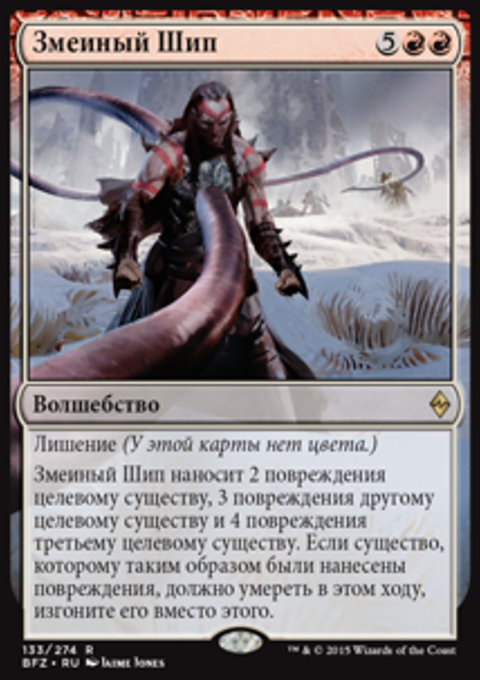Змеиный Шип наносит 2 повреждения целевому существу, 3 повреждения другому целевому существу и 4 повреждения третьему целевому существу. Если существо, которому таким образом были нанесены повреждения, должно умереть в этом ходу, изгоните его вместо этого.