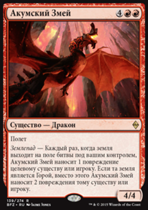 Землепад — Каждый раз, когда земля выходит на поле битвы под вашим контролем, Акумский Змей наносит 1 повреждение целевому существу или игроку. Если та земля является Горой, вместо этого Акумский Змей наносит 2 повреждения тому существу или игроку.
