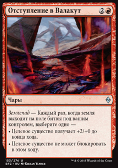 Землепад — Каждый раз, когда земля выходит на поле битвы под вашим контролем, Валакутский Хищник получает +2/+2 до конца хода.