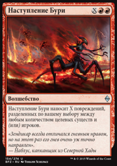 Наступление Бури наносит X повреждений, разделенных по вашему выбору между любым количеством целевых существ и (или) игроков.