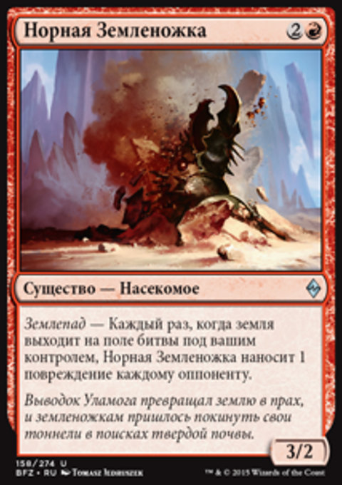 Землепад — Каждый раз, когда земля выходит на поле битвы под вашим контролем, Норная Земленожка наносит 1 повреждение каждому оппоненту.
