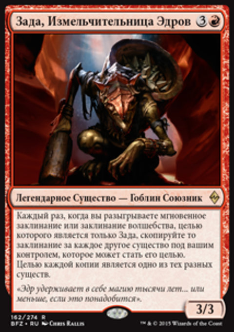 Каждый раз, когда вы разыгрываете мгновенное заклинание или заклинание волшебства, целью которого является только Зада, скопируйте то заклинание за каждое другое существо под вашим контролем, которое может стать его целью. Целью каждой копии является одно из тех разных существ.