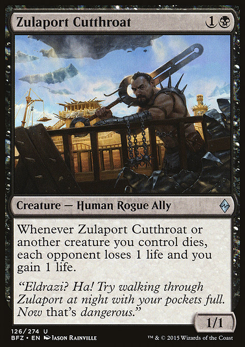 Каждый раз, когда Головорез из Зулапорта или другое существо под вашим контролем умирает, каждый оппонент теряет 1 жизнь, а вы получаете 1 жизнь.