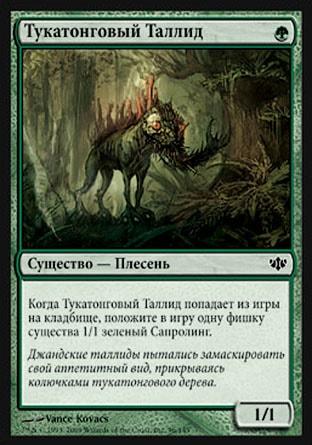 Когда Тукатонговый Таллид попадает из игры на кладбище, положите в игру одну фишку существа 1/1 зеленый Сапролинг.