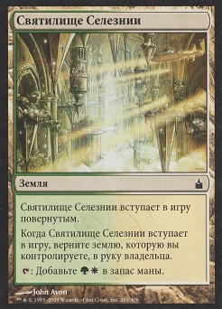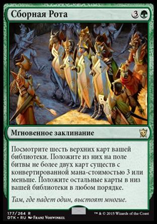 Найдите в вашей библиотеке карту существа с конвертированной мана-стоимостью Х или меньше и положите ее на поле битвы. Затем перетасуйте вашу библиотеку.
