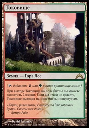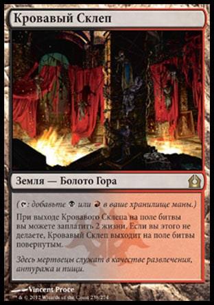 , заплатите 1 жизнь, пожертвуйте Кровавую Топь: найдите в вашей библиотеке карту Болота или Горы и положите ее на поле битвы. Затем перетасуйте вашу библиотеку.
