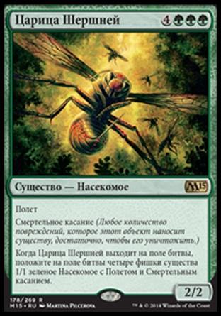Когда Царица Шершней выходит на поле битвы, положите на поле битвы четыре фишки существа 1/1 зеленое Насекомое с Полетом и Смертельным касанием.