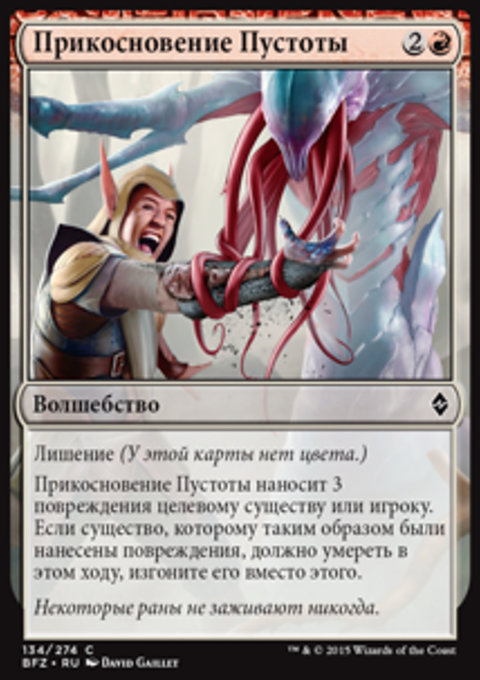 Прикосновение Пустоты наносит 3 повреждения целевому существу или игроку. Если существо, которому таким образом были нанесены повреждения, должно умереть в этом ходу, изгоните его вместо этого.