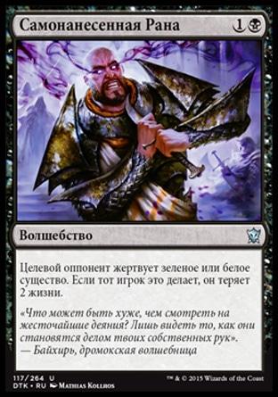 Целевой оппонент жертвует зеленое или белое существо. Если тот игрок это делает, он теряет 2 жизни.