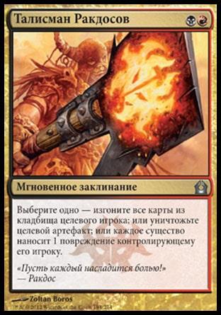 Выберите одно — изгоните все карты из кладбища целевого игрока; или уничтожьте целевой артефакт; или каждое существо наносит 1 повреждение контролирующему его игроку.
