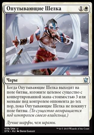 Когда Опутывающие Шелка выходят на поле битвы, изгоните целевое существо с конвертированной мана-стоимостью 3 или меньше под контролем оппонента до тех пор, пока Опутывающие Шелка не покинут поле битвы. (То существо возвращается под контролем своего владельца.)