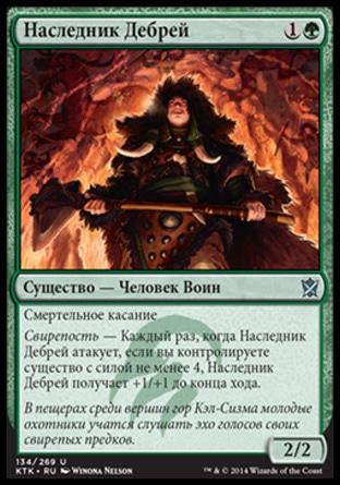 Свирепость — Каждый раз, когда Наследник Дебрей атакует, если вы контролируете существо с силой не менее 4, Наследник Дебрей получает +1/+1 до конца хода.