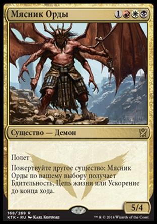 Пожертвуйте другое существо: Мясник Орды по вашему выбору получает Бдительность, Цепь жизни или Ускорение до конца хода.