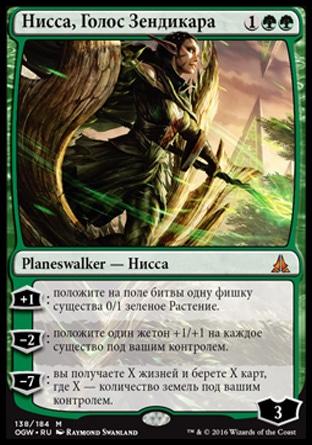 Когда Клятва Ниссы выходит на поле битвы, посмотрите три верхние карты вашей библиотеки. Вы можете показать находящуюся среди них карту существа, земли или planeswalker-а и положить ее в вашу руку. Положите остальные карты в низ вашей библиотеки в любом порядке.