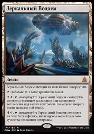 , пожертвуйте Зеркальный Водоем: скопируйте целевое мгновенное заклинание или заклинание волшебства под вашим контролем. Вы можете выбрать новые цели для той копии.