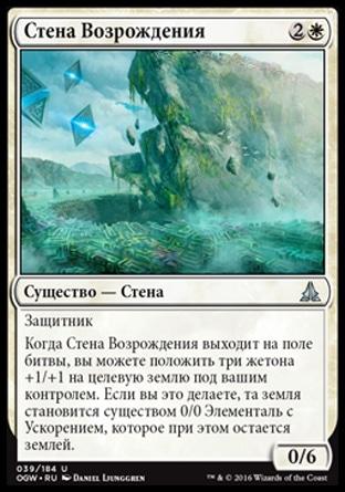 Когда Стена Возрождения выходит на поле битвы, вы можете положить три жетона +1/+1 на целевую землю под вашим контролем. Если вы это делаете, та земля становится существом 0/0 Элементаль с Ускорением, которое при этом остается землей.