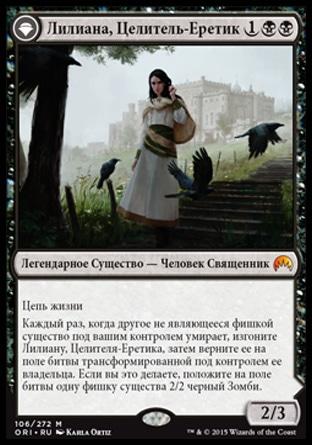 Каждый раз, когда другое не являющееся фишкой существо под вашим контролем умирает, изгоните Лилиану, Целителя-Еретика, затем верните ее на поле битвы трансформированной под контролем ее владельца. Если вы это делаете, положите на поле битвы одну фишку существа 2/2 черный Зомби.