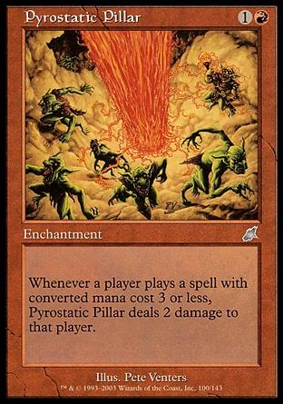 Whenever a player casts a spell with converted mana cost 3 or less, Pyrostatic Pillar deals 2 damage to that player.