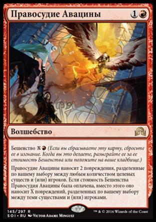 Правосудие Авацины наносит 2 повреждения, разделенные по вашему выбору между любым количеством целевых существ и (или) игроков. Если стоимость Бешенства Правосудия Авацины была оплачена, вместо этого оно наносит X повреждений, разделенных по вашему выбору между теми существами и (или) игроками.