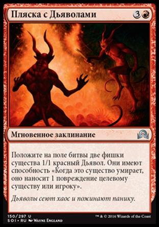 Положите на поле битвы четыре фишки существа 1/1 красный Дьявол. Они имеют способность «Когда это существо умирает, оно наносит 1 повреждение целевому существу или игроку».