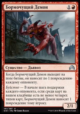 Буйство — В начале шага поддержки каждого оппонента, если среди карт на вашем кладбище есть не менее четырех типов карт, Бормочущий Демон наносит 1 повреждение тому игроку.