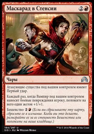 Каждая принадлежащая вам карта существа-Вампира, не находящаяся на поле битвы, имеет Бешенство. Стоимость Бешенства равна ее мана-стоимости. (Если вы сбрасываете карту с Бешенством, сбросьте ее в изгнание. Когда вы это делаете, разыграйте ее за ее стоимость Бешенства или положите на ваше кладбище.)