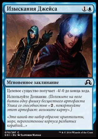 Каждый раз, когда вы разыгрываете мгновенное заклинание или заклинание волшебства, используйте Дознание. (Положите на поле битвы одну фишку бесцветного артефакта Улика со способностью «