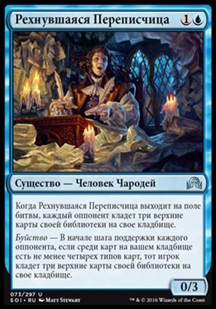Когда Рехнувшаяся Переписчица выходит на поле битвы, каждый оппонент кладет три верхние карты своей библиотеки на свое кладбище.