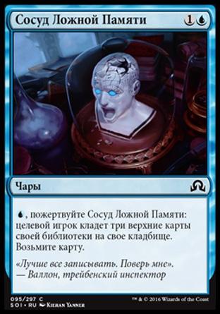 , пожертвуйте Сосуд Ложной Памяти: целевой игрок кладет три верхние карты своей библиотеки на свое кладбище. Возьмите карту.