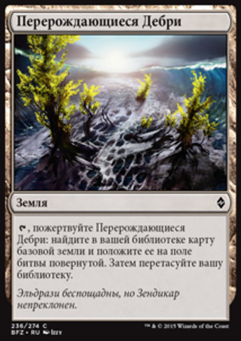 , пожертвуйте Перерождающиеся Дебри: найдите в вашей библиотеке карту базовой земли и положите ее на поле битвы повернутой. Затем перетасуйте вашу библиотеку.