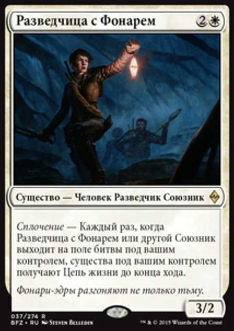 Сплочение — Каждый раз, когда Разведчица с Фонарем или другой Союзник выходит на поле битвы под вашим контролем, существа под вашим контролем получают Цепь жизни до конца хода.