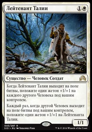 Каждый раз, когда другой Человек выходит на поле битвы под вашим контролем, положите один жетон +1/+1 на Лейтенанта Талии.