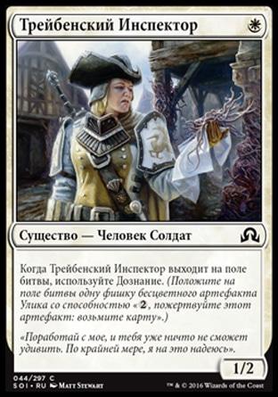 Когда Трейбенский Инспектор выходит на поле битвы, используйте Дознание. (Положите на поле битвы одну фишку бесцветного артефакта Улика со способностью «