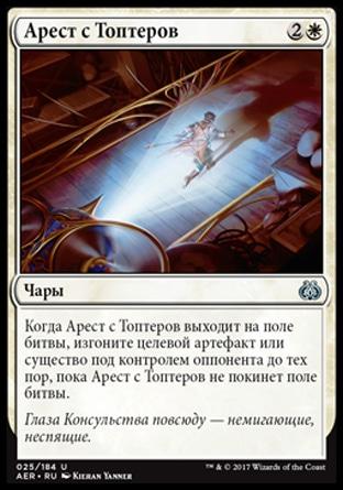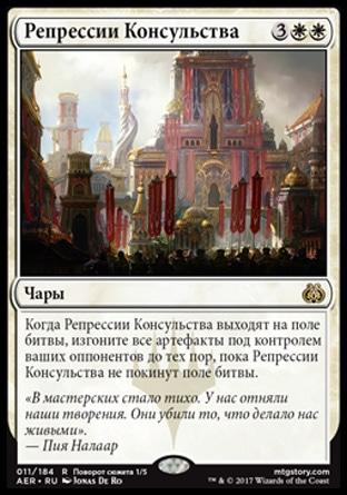 Когда Репрессии Консульства выходят на поле битвы, изгоните все артефакты под контролем ваших оппонентов до тех пор, пока Репрессии Консульства не покинут поле битвы.